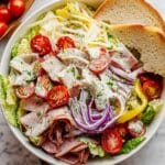 This Grinder Salad is a hearty and flavorful Italian-inspired salad featuring a mix of crisp romaine and iceberg lettuce, cherry tomatoes, pepperoncini, thinly sliced deli meats, provolone cheese, and a zesty homemade dressing. Perfect for a quick lunch or meal prep, this salad combines fresh vegetables, savory meats, and a tangy, creamy dressing for a satisfying and easy-to-make dish.