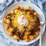 6. Combine with Potatoes: In a large mixing bowl, combine the diced potatoes with the beef mixture. Fold in the sour cream and half of the shredded cheddar cheese until the ingredients are evenly incorporated.