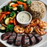 This Hibachi Steak & Shrimp Plate brings the flavors of a Japanese steakhouse right to your kitchen. Featuring tender steak, juicy shrimp, garlicky fried rice, and sautéed veggies, it’s a complete, satisfying meal. Add a creamy dipping sauce for the perfect finishing touch.