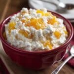 A close-up of a red bowl filled with a creamy dish made of small, uneven chunks of orange fruit mixed with thick, white cottage cheese, creating a textured, fluffy appearance. The bowl sits on a wooden surface with a white plate and silver spoon behind it, slightly out of focus. The mixture looks fresh and soft, with the fruit pieces partly covered by the white cheese layer but still visible throughout. Photo taken with an iphone --ar 4:5 --v 7
