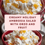 Keywords: Holiday Ambrosia Salad, fruit salad, orzo pasta salad, pineapple salad, mandarin oranges, creamy salad, festive salad, holiday recipe