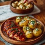 This Honey BBQ Chicken with Creamy Garlic Parmesan Potatoes recipe combines tender, flavorful chicken thighs coated in a sweet and tangy honey barbecue sauce with rich, cheesy Yukon gold potatoes baked in a luscious garlic parmesan cream sauce. Perfect for a comforting family dinner, this dish offers a delightful balance of smoky, savory, and creamy flavors all baked together for a crowd-pleasing meal.