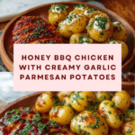 This Honey BBQ Chicken with Creamy Garlic Parmesan Potatoes is a comforting one-dish meal packed with flavor. Tender chicken thighs glazed in sweet and tangy barbecue sauce sit atop a bed of rich, garlicky potatoes with a cheesy parmesan sauce. It’s perfect for a cozy dinner that feels special but is easy to prepare.