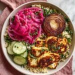 A vibrant and flavorful Hot Honey Halloumi and Couscous Salad featuring tangy sumac-marinated onions, crisp greens, and tender halloumi cheese seared to perfection in a sweet and spicy honey-laced lemon marinade. This recipe beautifully balances textures and flavors for a refreshing and satisfying meal.