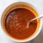 A close-up view of a white bowl filled with a thick, deep red sauce that has a slightly oily texture and small bits of spices visible throughout. The sauce is garnished with small pieces of green herbs scattered on top. A silver spoon is partially submerged on the right side of the bowl. The bowl sits on a white marbled surface with a few small green herb leaves scattered around it. photo taken with an iphone --ar 4:5 --v 7