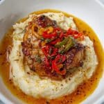 A white round plate holds a dish with two main layers. The bottom layer is a thick, creamy mashed potatoes with a slightly chunky texture and a pale off-white color, spread in a wide circular shape. The top layer is a crispy, golden-brown roasted chicken thigh, shiny with a glaze and topped with slivers of red, yellow, and green peppers, adding pops of color. Surrounding the mashed potatoes is a pool of orange-brown oily sauce with visible specks of black pepper and herbs that lightly coats the base of the plate. The photo is taken on a white marbled surface. photo taken with an iphone --ar 4:5 --v 7