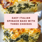 This Italian Spinach Bake is a creamy, cheesy casserole featuring fresh sautéed spinach blended with ricotta, mozzarella, and Parmesan cheeses. Baked until bubbly and golden, it’s a comforting and flavorful vegetarian dish perfect as a side or light main course.