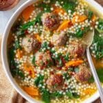 This classic Italian Wedding Soup recipe features tender homemade meatballs simmered in a savory chicken broth with vegetables, pasta, and fresh baby spinach. A comforting and hearty soup that’s perfect for any season and easy to prepare from scratch.
