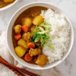 This Japanese chicken curry recipe features tender bite-sized chicken pieces simmered with chunky potatoes and carrots in a rich, flavorful curry sauce made from butter, curry powder, and aromatic spices. The curry is thickened with all-purpose flour and simmered until perfectly tender, making it a comforting and hearty meal typically served with steamed Japanese or jasmine rice.