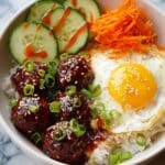 These Korean BBQ Meatball Rice Bowls feature tender ground beef meatballs glazed with a flavorful sweet and spicy Korean BBQ sauce. Paired with fluffy jasmine rice, fresh cucumber, shredded carrots, and a creamy gochujang-spiked mayo, this dish balances savory, tangy, and spicy elements for a delicious, easy-to-make bowl meal perfect for weeknight dinners.