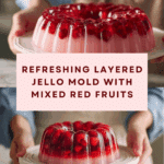 This layered jello mold is a stunning and delicious dessert perfect for any gathering. With vibrant red fruit suspended in a tart cranberry gelatin base, topped with a creamy, sweet layer, it offers a beautiful balance of flavors and textures.