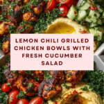 Lemon Chili Grilled Chicken Bowls with Fresh Cucumber Salad & Hummus are a vibrant, flavor-packed meal combining zesty, spicy grilled chicken with a refreshing cucumber salad and creamy hummus base. Perfectly balanced and easy to prepare, these bowls offer a delightful mix of textures and tastes, ideal for a wholesome lunch or light dinner.