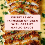 A flavorful Lemon Parmesan Crusted Chicken served with a rich and creamy garlic sauce, perfectly pan-fried to golden brown. This dish combines zesty lemon, savory Parmesan, and a luscious cream sauce for an elegant yet simple meal.