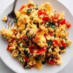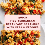 A quick and vibrant Mediterranean Breakfast Scramble featuring fresh tomatoes, red pepper, spinach, and scallions, combined with creamy feta cheese and fluffy scrambled eggs. This healthy and flavorful dish is perfect for a nutritious start to your day, packed with colorful veggies and Mediterranean-inspired ingredients.