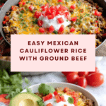 Keywords: Mexican Cauliflower Rice, low-carb Mexican recipe, ground beef cauliflower rice, healthy skillet dinner, taco seasoning rice dish