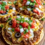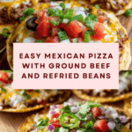This Mexican Pizza Ground Beef recipe features crispy tortillas layered with seasoned ground beef, refried beans, enchilada sauce, and a colorful topping of cheese, tomatoes, green onions, and olives. It’s a quick, flavorful twist on classic pizza with a Mexican flair, perfect for a hearty weeknight meal.