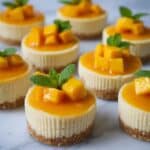 Keywords: mango cheesecake bites, no bake cheesecake, mini desserts, mango puree recipe, easy cheesecake, tropical dessert, fruit topped cheesecake