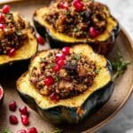 This Mushroom and Quinoa Stuffed Acorn Squash is a wholesome and hearty vegetarian dish perfect for cozy dinners. Roasted acorn squash halves are filled with a savory mixture of sautéed baby bella mushrooms, shallots, garlic, and fluffy quinoa cooked in vegetable broth and milk. Finished with Parmesan cheese, a drizzle of tangy balsamic glaze, and optional pomegranate arils for a burst of color and flavor, this recipe offers a delightful blend of textures and tastes that’s both nutritious and satisfying.