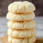 A stack of five thick, soft, pale yellow cookies with a rough, crumbly texture is shown, each cookie round and fluffy looking, resting on a small square piece of parchment paper. The cookies are evenly layered directly on top of each other, making a tall, neat pile. The background is a white marbled texture, slightly blurred, helping the light color and texture of the cookies stand out. photo taken with an iphone --ar 4:5 --v 7