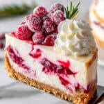 This No-Bake Cranberry White Chocolate Cheesecake is a luscious, creamy dessert featuring a cinnamon graham cracker crust, a swirled white chocolate and cranberry filling, and a beautifully garnished top with sugared cranberries and rosemary sprigs. Perfect for holiday celebrations or anytime you crave a festive, cool treat without baking.