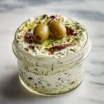 - Transfer and Garnish: Spoon the dip into a serving bowl or jar. Drizzle with a little extra virgin olive oil over the top and place two whole green olives as a garnish to enhance presentation and flavor.