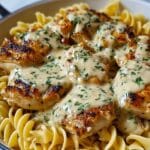 A delicious and comforting one-pan meal featuring juicy chicken breasts cooked in a creamy buttered noodle sauce. This recipe combines tender egg noodles with a rich sauce made from chicken broth, heavy cream, garlic, butter, and Parmesan cheese, all cooked together in a skillet for easy cleanup and perfect flavor melding.
