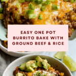 Keywords: one pot burrito bake, ground beef recipe, easy Mexican casserole, one pot dinner, skillet rice bake, black beans and rice