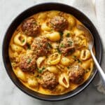 Keywords: Meatball pasta, one pot pasta, baked meatballs, creamy tomato sauce, Italian pasta recipe, weeknight dinner