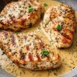 This Pan Seared Chicken Breasts with Lemon Mustard Sauce recipe features juicy, golden-brown chicken breasts cooked in a flavorful skillet sauce made from garlic, chicken broth, Dijon mustard, lemon juice, and Italian seasoning. The chicken is scored to enhance tenderness and absorb the tangy, aromatic sauce, making it an easy and elegant meal perfect for any day of the week.
