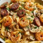 Savor the rich flavors of Cajun cuisine with this Delicious Pappadeaux Mardi Gras Pasta, featuring tender chicken, succulent shrimp, spicy andouille sausage, and a creamy Parmesan sauce tossed with perfectly cooked penne pasta. This dish is a vibrant celebration of bold spices and hearty ingredients, perfect for any Cajun lover craving an indulgent, flavorful meal.