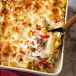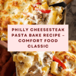 Keywords: Philly cheesesteak pasta bake, rigatoni casserole, baked pasta with steak, creamy pasta bake, comfort food casserole