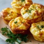 A close-up of several small, golden brown egg muffin cups arranged on a round white plate. Each muffin has a puffy, soft texture with lightly browned, crispy edges and visible small green herb bits sprinkled on top and inside. The muffins show a light yellow and white color mix from the eggs and cheese, creating a fluffy, layered look. A sprig of fresh green parsley lies on the plate near the front muffin, adding a touch of color contrast. The dish is set on a white marbled surface. photo taken with an iphone --ar 4:5 --v 7
