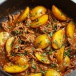 The image shows a black cooking pan filled with a dish that has thick slices of yellow potatoes and shredded brown meat mixed together in a rich, reddish-brown sauce. The meat and potatoes are scattered throughout the pan, and the surface of the food is sprinkled with chopped green herbs for a fresh touch. The texture appears hearty and saucy, with the potatoes' smooth edges and the meat's tender, shredded pieces visible. The pan sits on a white marbled surface, creating a clean and elegant background. photo taken with an iphone --ar 4:5 --v 7