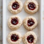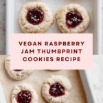 Keywords: raspberry jam cookies, vegan thumbprint cookies, vegan dessert, vegan baking, chocolate chip cookies, jam cookies