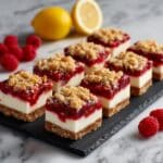 The image shows seven square dessert bars arranged on a black slate serving board, placed on a white marbled textured surface. Each bar has three visible layers: the bottom layer is a crumbly, light brown crust, the middle layer is a smooth, creamy white filling, and the top layer is made of bright red berries mixed with a golden-brown crumbly oat topping. In the background, there are fresh red raspberries and a sliced lemon adding color contrast. The dessert pieces are evenly cut and neatly arranged in two rows, with soft natural lighting highlighting the textures. Photo taken with an iphone --ar 4:5 --v 7