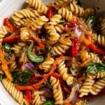 Keywords: roast pepper pasta salad, roasted vegetable pasta, fusillotti salad, Mediterranean pasta salad, summer pasta salad, vegetarian pasta salad
