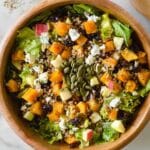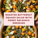 Keywords: butternut squash salad, honey balsamic vinaigrette, roasted squash salad, farro salad, autumn salad, mixed greens salad, healthy salad