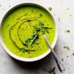A white bowl filled with smooth, bright green soup, with a swirl of darker green oil drizzled on top. The soup is garnished with small sprigs of fresh green herbs and a sprinkling of coarse black pepper across the surface. A shiny silver spoon rests inside the bowl, its handle extending out towards the bottom right of the image. The bowl is placed on a white marbled textured surface with some scattered green herb bits and pepper specks around it. photo taken with an iphone --ar 4:5 --v 7