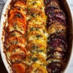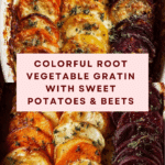 Keywords: root vegetable gratin, sweet potato gratin, parsnip recipe, beet gratin, vegetarian side dish, baked vegetable casserole