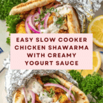 Keywords: Chicken Shawarma, Slow Cooker Recipes, Middle Eastern Chicken, Greek Yogurt Marinade, Shawarma Pita