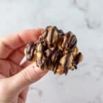 A close-up of a woman's hand holding a small, irregularly shaped cluster of light tan peanuts covered with a thick, smooth dark brown chocolate drizzle on top. The peanut cluster has a textured surface with visible nut pieces and rich chocolate lines flowing unevenly over it. The background is a white marbled texture, making the peanut and chocolate cluster stand out clearly. photo taken with an iphone --ar 4:5 --v 7