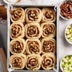 6. Assemble Rolls: Grease or line a 9”x13” (23cm x 33cm) baking dish. Roll dough out on lightly floured surface into 24”x16” (60cm x 40cm) rectangle, keeping edges square. Spread brown sugar cinnamon filling evenly over dough, then spread apple filling on top. Roughly chop toasted pecans and sprinkle evenly.