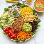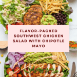 A vibrant and flavorful Southwest Salad featuring seasoned grilled chicken, fresh vegetables, black beans, corn, and a spicy chipotle mayo dressing, perfect for a hearty and healthy meal.