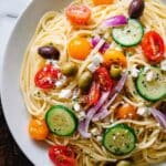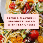 Keywords: spaghetti salad, pasta salad, Mediterranean salad, summer salad, feta cheese, cherry tomatoes, cucumber salad, easy pasta recipe
