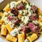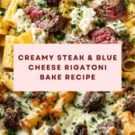 A rich and comforting Steak & Blue Cheese Rigatoni Bake featuring tender seared steak, creamy blue cheese sauce, and perfectly cooked rigatoni pasta, topped with mozzarella cheese and baked to golden perfection. This hearty casserole combines bold flavors with a creamy texture, ideal for a satisfying dinner.