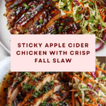 Keywords: Sticky Apple Cider Chicken, autumn chicken recipe, apple cider glaze, crispy chicken thighs, autumn slaw, cabbage slaw with apple