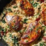 This chicken risotto is a comforting and flavorful dish perfect for any night of the week. Creamy arborio rice is cooked slowly with chicken stock, sun-dried tomatoes, and fresh spinach, then topped with perfectly seared, seasoned chicken thighs. It’s a satisfying meal that combines rich textures and vibrant tastes.