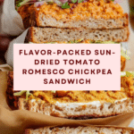 This Sun-Dried Tomato Romesco Chickpea Salad Sandwich is a vibrant, flavorful vegan sandwich combining a smoky and tangy romesco sauce with a hearty mashed chickpea salad. Enhanced by roasted cabbage and optional marinated onions, it’s a perfect plant-based meal featuring Mediterranean-inspired ingredients served on toasted sourdough bread.