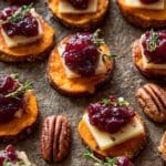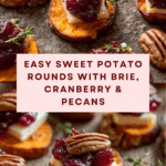 Delicious Sweet Potato Rounds topped with creamy dairy-free brie, tangy cranberry sauce, and crunchy pecans. These bite-sized baked treats make a perfect appetizer or snack, combining the natural sweetness of roasted sweet potatoes with savory and festive toppings.