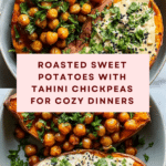 Keywords: roasted sweet potatoes, chickpeas, tahini sauce, vegan dinner, Middle Eastern recipe, roasted vegetables, healthy cozy meal